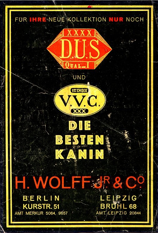 Anzeige des Rauchwaren-Großhändlers H. Wolff jr. & Co., Kurstraße 51, Berlin und Leipzig, Brühl 68