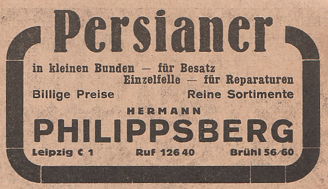 Anzeige des Rauchwaren-Großhändlers Hermann Philippsberg, Brühl 56-60, Leipzig C 1 (1933)