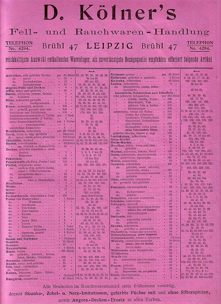 Anzeige des Rauchwarenhändlers D. Kölner, Leipzig, Brühl 47 in einer Fachzeitschrift (1903) Veröffentlicht am 20. Dezember 2018 200teilen twittern merken teilen BewertungAnzeige des Rauchwarenhändlers D. Kölner, Leipzig, Brühl 47 in einer Fachzeitschrift (1903)