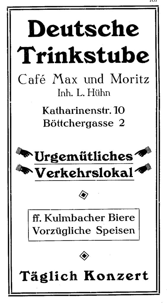 Cafe Max u.Moritz, Katharinenstr.10/Böttchergasse 2 Veröffentlicht am 1. Dezember 2018 202teilen twittern merken teilen BewertungCafe Max u.Moritz, Katharinenstr.10/Böttchergasse 2