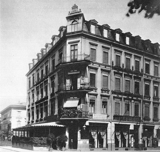 Das Café Merkur in Leipzig, Dittrichring 5. Links ein Gebäude in Lurgensteins Garten um 1920 / Unbekannt etwa 1930 [Public domain], via Wikimedia Commons1877 wurde in der Straße An der Pleiße (heute Dittrichring) gegenüber der Thomaskirche und neben dem Zugang zur Wohnanlage Lurgensteins Garten das Café Carola eröffnet, das nach fünf Jahren seinen Namen in Merkur änderte. Der Besitzer hieß Richard Keil.