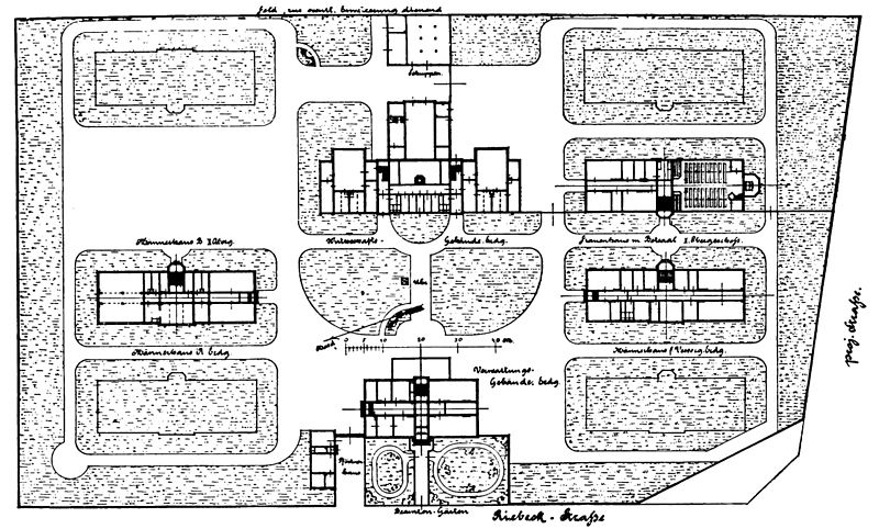 Lageplan des geplanten Krankenhauses St. Georg in Leipzig-Eutritzsch die im hinteren Drittel dargestellten Gebäude wurden nicht errichtet