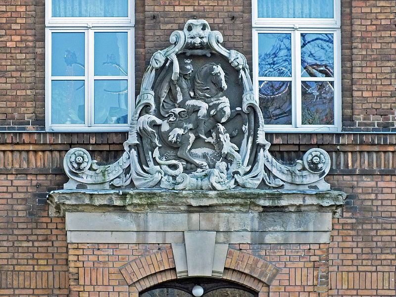 Georgsrelief am Verwaltungsgebäude des Wohnprojektes Riebeckstraße (ehemals Zwangsarbeitsanstalt zu St. Georg) / Geisler Martin [CC BY-SA 3.0], via Wikimedia Commons