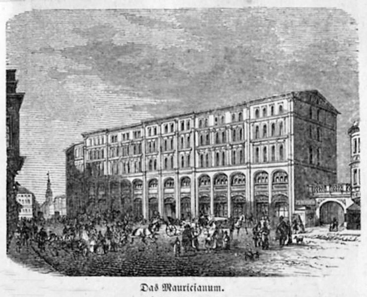 Bereits reichlich 30 Jahre später entschloss man sich, die Colonnaden durch ein mehrstöckiges Haus zu ersetzen. Albert Geutebrück (1801–1868) entwarf ein fünfstöckiges Gebäude mit relativ schlichter Fassade zur Grimmaischen Straße. Es wurde 1849 fertiggestellt. Es erhielt den Namen Mauricianum nach der latinisierten Namensform des Kurfürsten Moritz von Sachsen (1521–1553), der 1544 das säkularisierte Paulinerkloster der Universität übereignet hatte.