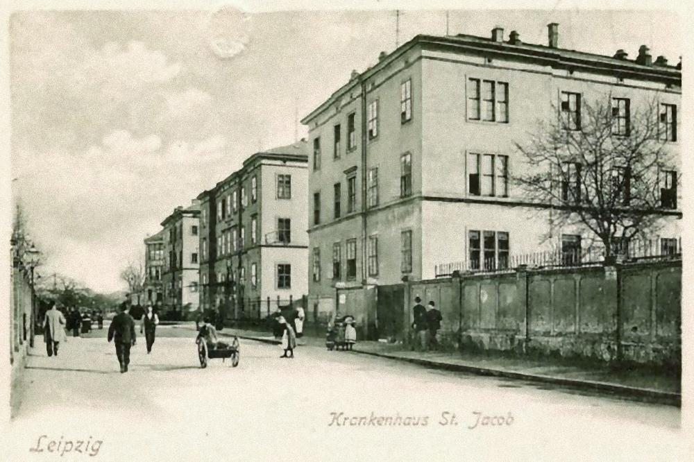 Das Hauptgebäude des Städtischen Krankenhauses St. Jakob in Leipzig um 1900 / unbekannt, (Dr. Trenkler & Co. (Verleger)), Public domain, via Wikimedia Commons