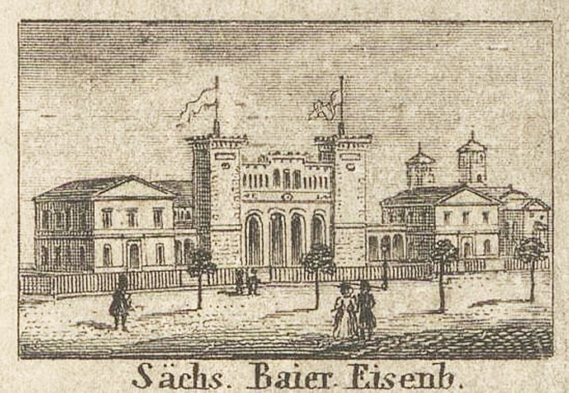 Randvignette Bayerischer Bahnhof auf einem Vogelschauplan von Leipzig 1847 / Public Domain