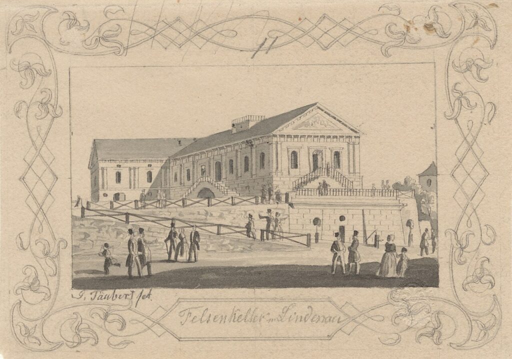 Bereits 1844 wurde auf dem Kellergewölbe eine Gaststätte im klassizistischen Stil errichtet, die den Namen Felsenkeller trug. Der Restaurationssaal wurde schnell zu einem beliebten Ausflugsziel für Leipziger Bürger und wurde in den folgenden Jahrzehnten mehrfach erweitert. Auch eine kleine Parkanlage mit einem Pavillon wurde auf dem Areal angelegt, die den Besuchern Erholung bot.