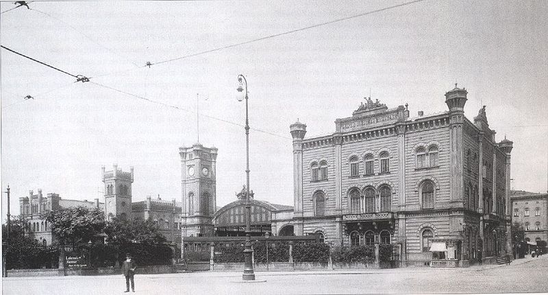 Der Magdeburger (links im Bild) und der Dresdner Bahnhof (rechts) in Leipzig (um 1900) / Hermann Walter (1838-1909) [Public domain]