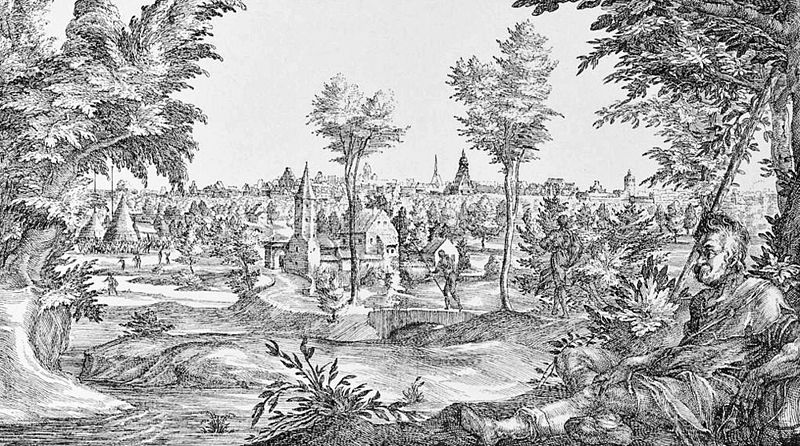 Leipzig 1594 von Westen gesehen, vorn der Kuhturm in Lindenau / Gustav Wustmann: Bilderbuch aus der Geschichte der Stadt Leipzig für alt und jung, Verlag Hermann Zieger, Leipzig 1897, S. 22, Public Domain