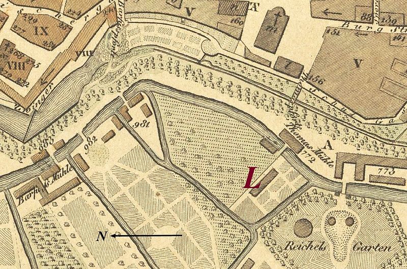 Lurgensteins Garten (L) auf einem Leipziger Stadtplanausschnitt westlich der Innenstadt von 1830 / Heinrich Leutemann [Public domain]