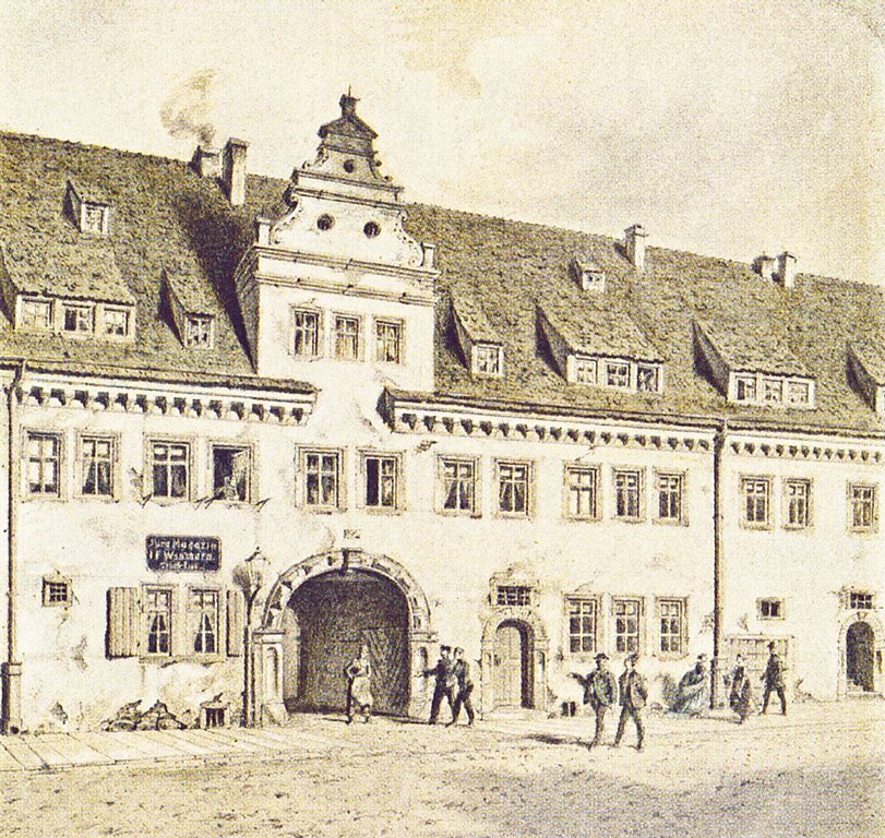 Torhaus des Leipziger Marstalls um 1860 / Friedrich Wilheln Heine [Public domain]