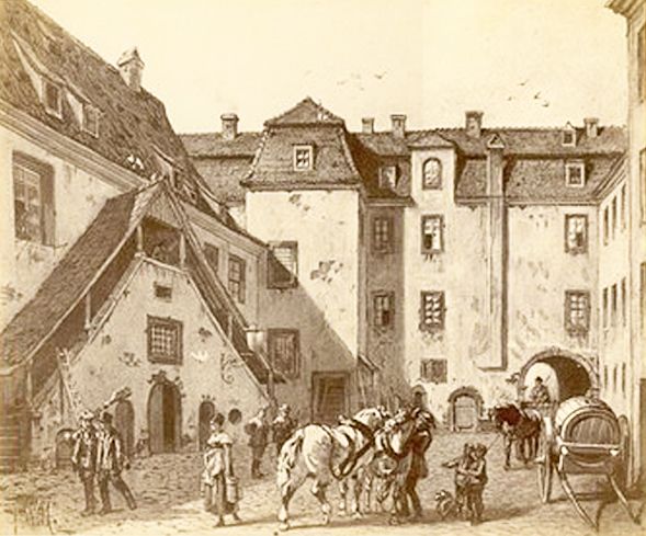 Innenhof des städtischen Marstalls in Leipzig, vor 1867 / Friedrich Wilheln Heine [Public domain]