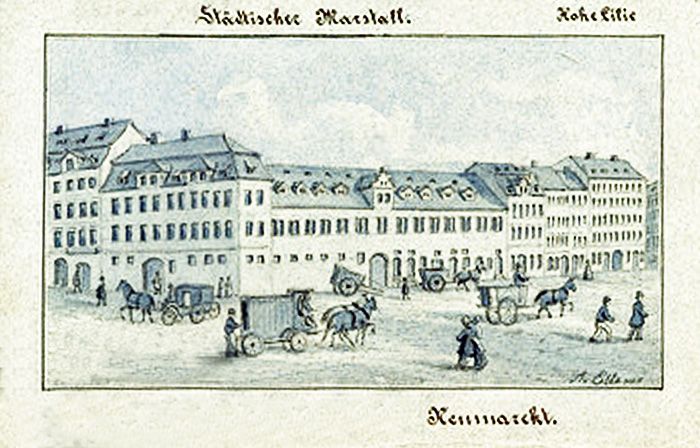 Zun gemeinen Gebäuden gehöret auch das grosse steinerne Gebäude auf dem Neumarckt / welches Der Marstall heisset / darinnen E. E. RathsPferde / sammt denen zugehörigen Zeug und Wagen gehalten werden. Dieses Gebäude ist mit denen Wohnungen / darunter Ställe und stattlich gewölbte Keller befindlich / wie auch denen angebaueten Häusern / darinnen der Ober-Voigt und die drey Ausreuter oder Rathsbediente ihre Wohnungen haben / besage der Leipzigischen Chronicken / Anno 1575. erbauet worden. Vor diesem ist E. Ed. Raths Marstall in der Ritterstrasse gewesen / wo itzo das rothe Collegium stehet / …