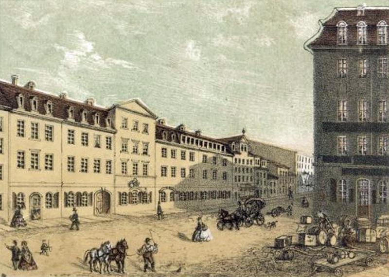 Das Haus „Goldener Bär“ in Leipzig um 1850, farbige Lithographie / Public Domain