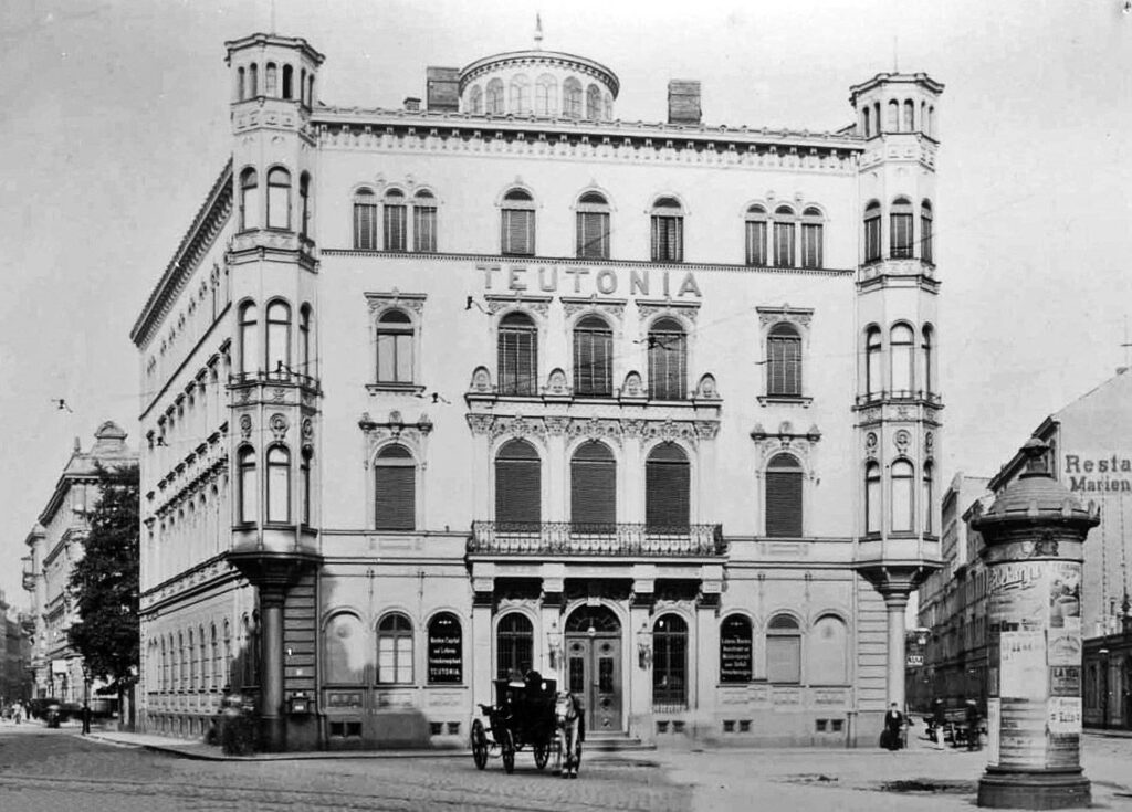 Das vierstöckige Gebäude war im klassizistischen Stil gehalten und beeindruckte mit einer reich verzierten Fassade, die Eckerkern und Balkone aufwies. Der Namenszug TEUTONIA war an der Fassade angebracht, die zu einem kleinen dreieckigen Platz hin ausgerichtet war, der durch die spitzwinklige Einmündung der Carlstraße entstand. Das Gebäude breitete sich entlang der Schützenstraße aus und wies zehn Fensterachsen auf, wodurch es ein markantes Erscheinungsbild erhielt.
