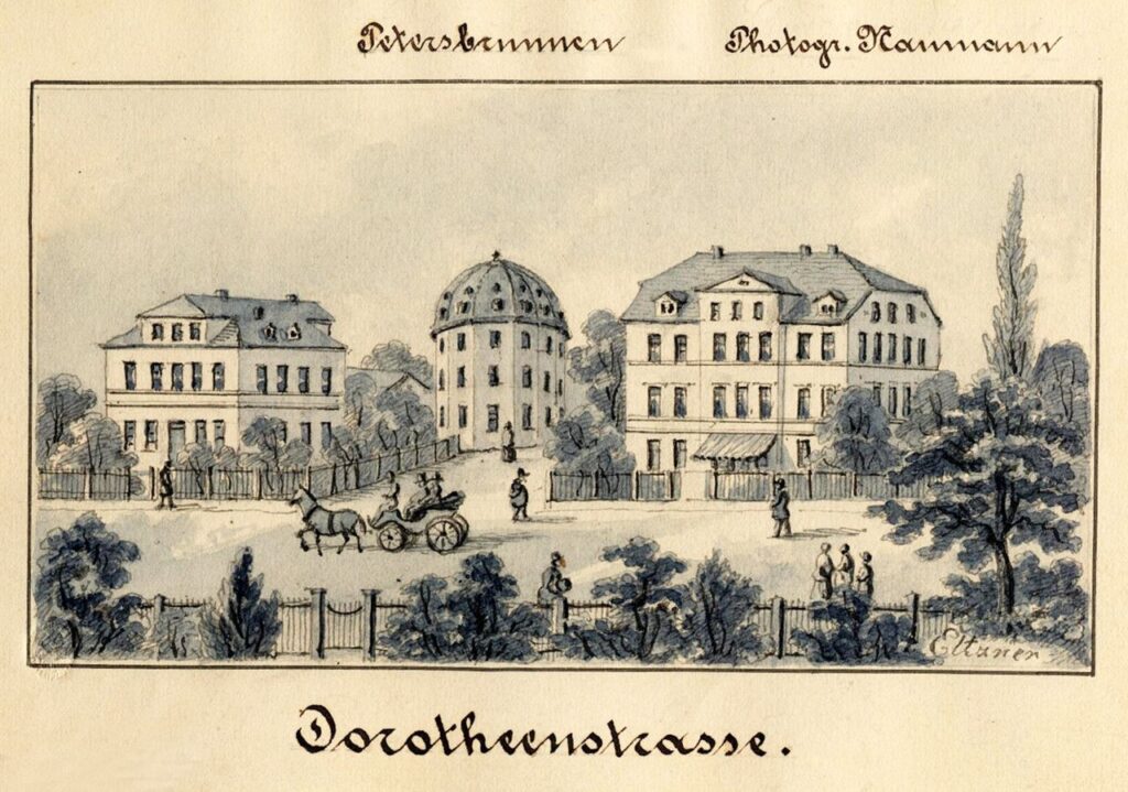 Mit der fortschreitenden Erschließung der Westvorstadt änderte sich auch die Umgebung des Petersbrunnens. Ursprünglich in Reichels Garten gelegen, befand sich das Badehaus später etwas zurückgesetzt an einem Abzweig der Dorotheenstraße, die 1845 entstand und seit 1912 als Otto-Schill-Straße bekannt ist. Der Abzweig, an dem der Petersbrunnen lag, wurde 1923 in Apels Garten umbenannt, was die historische Verbindung zur ursprünglichen Gartenanlage betonte.