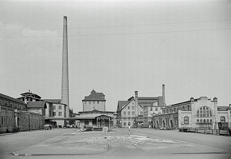 Garderoben und Speisesaal, Heizhaus mit Schornstein, Rinderkühlhaus, dahinter Großhandelshalle, Fettschmelzabteilung und Sanitätsschlachtung (v.links), 1952 / Deutsche Fotothek‎, CC BY-SA 3.0 DE