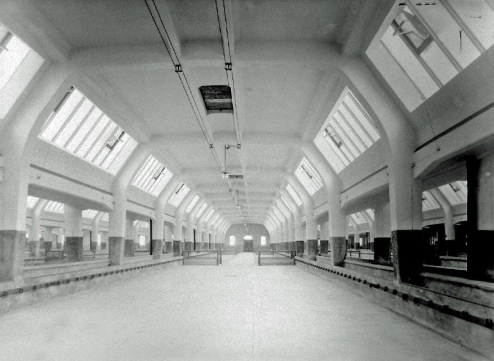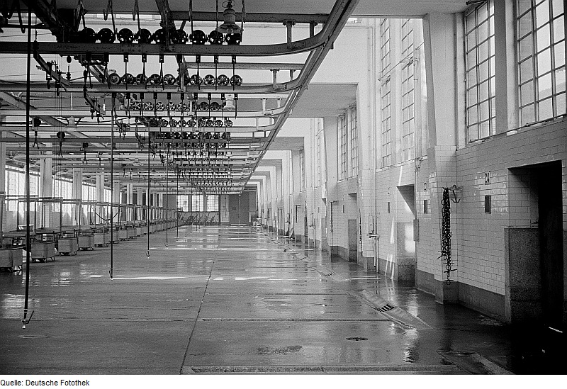 Rinderschlachthalle mit 20 Schlachtständen, 1952 / Deutsche Fotothek‎, CC BY-SA 3.0 DE