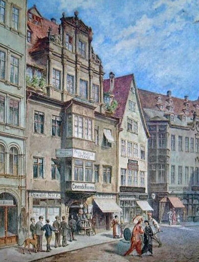 Deutrichs Hof an der Reichsstraße in Leipzig um 1900. Aquarell von Georg Dehn / Public Domain
