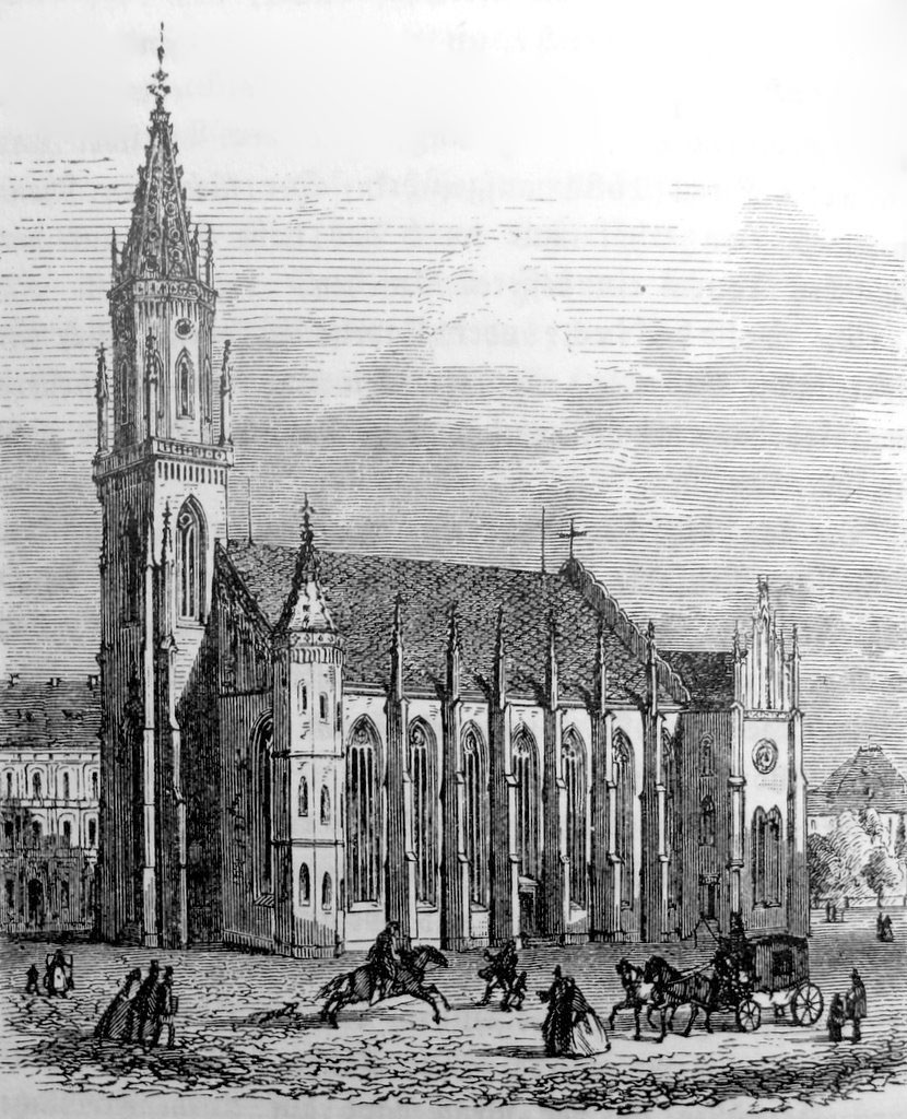 Stahlstich der Alten Trinitatiskirche in Leipzig, Ostansicht, 1847 / Public Domain
