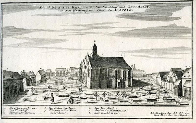 Die Johanniskirche in Leipzig um 1700 / Johann Stridbeck (Stecher) [Public domain]