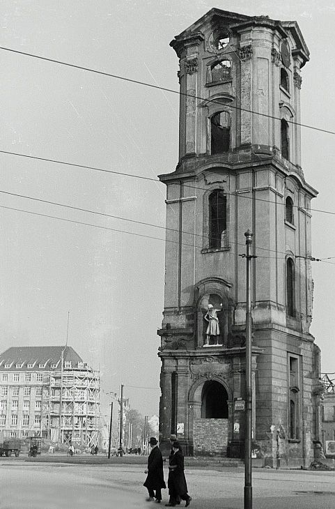 Ansicht der Turmruine der Johanniskirche am Johannsiplatz 1951 / Deutsche Fotothek‎ [CC BY-SA 3.0 de], via Wikimedia Commons
