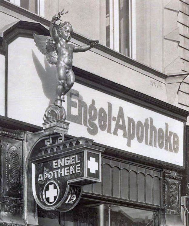 Die Engel-Apotheke am Markt in Leipzig, Werbeausleger, 1927 / Public Domain