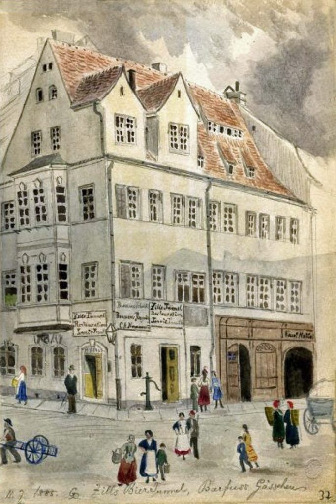 wich, sprach der Volksmund vom „Biertunnel“. Seit 1841 nennt er sich noch dem Bierwirt Zill. Unter ihm erlebte der Biertunnel am Barfußgäßchen seine erste Blütezeit. Zu den Stammgästen, die dem Hause Rang und Glanz verliehen, gehörte der damals vielgerühmte Lustspieldichter Roderich Benedix, zählte Viktor Neßler, den die Zeitgenossen begeistert feierten als den Schöpfer des „Trompeter von Säkkingen“, gehörten die durch ihre Lieder weitbekannten Komponisten Heinrich Pfeil und Karl Zöllner, dem schon zu Lebzeiten anerkannten Schöpfer und Betreuer des