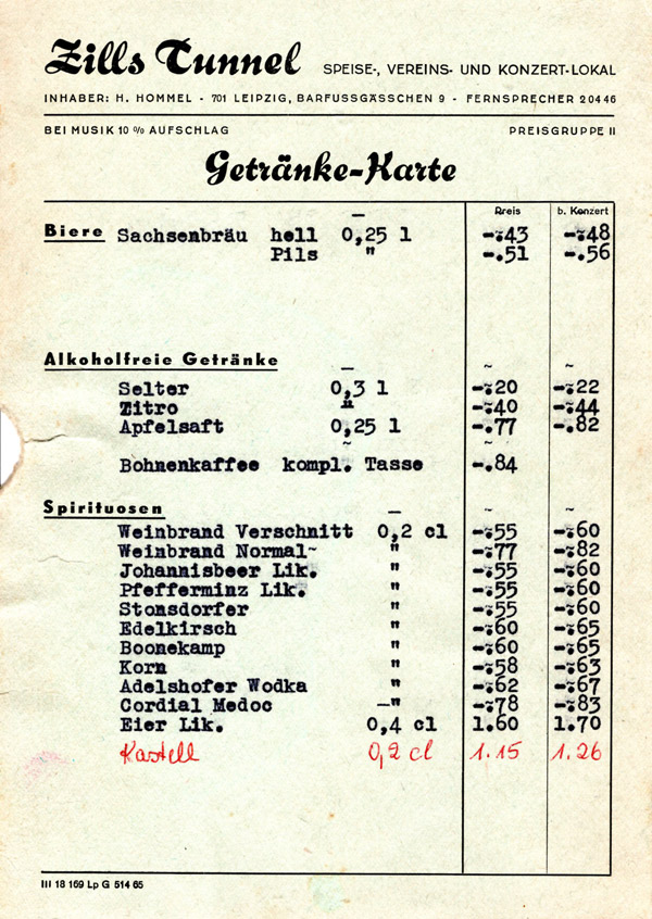 Hier noch eine Getränkekarte vom Zills Tunnel, ohne Datierung