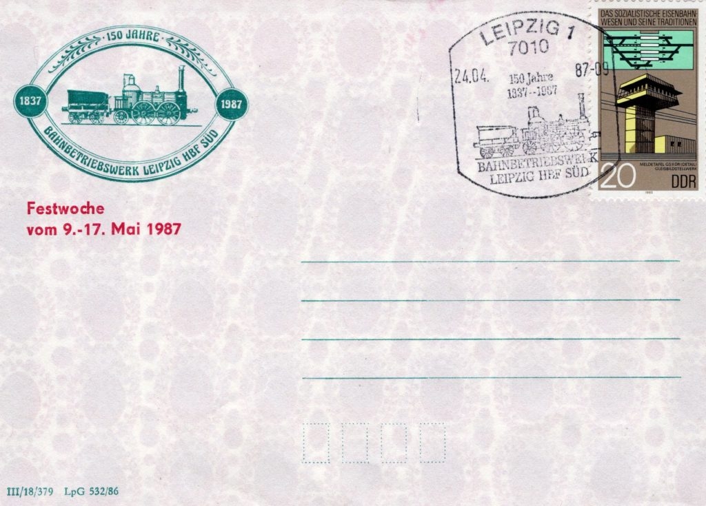 Ersttagsbrief 150 Jahre Bw Leipzig Hbf Süd (1987) Veröffentlicht am 16. Dezember 2018 188teilen twittern merken teilen BewertungErsttagsbrief 150 Jahre Bw Leipzig Hbf Süd (1987)Festwoche vom 9.- 17. Mai 1987