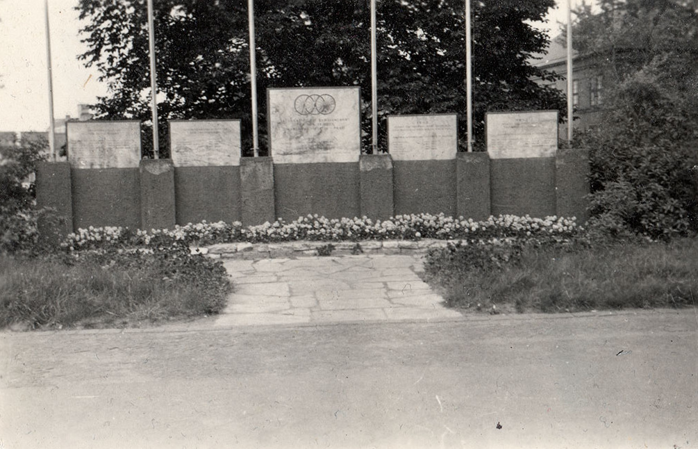 Das gesamte Monument erstreckte sich über eine Breite von etwa 10 Metern und war auf einem etwa 30 Zentimeter erhöhten Podest platziert, das von Blumenbeeten und einer Einfassung aus Natursteinen umrahmt war. Der Zugang zum Denkmal war mit bearbeitetem Naturstein gepflastert, und hinter den Stelen waren fünf Fahnenmasten installiert.