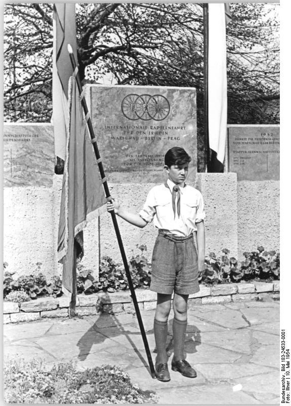„Internationale Radfernfahrt für den Frieden: Warschau – Berlin – Prag“, welche die Etappen der Friedensfahrt von 1954 darstellte.