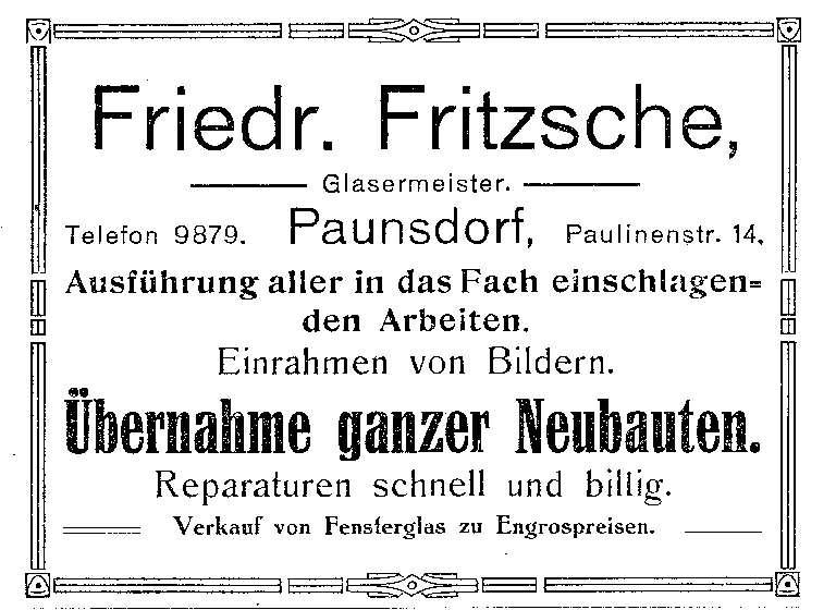 Friedr. Fritzsche, Paunsdorf, Paulinenstr.14 Veröffentlicht am 14. Dezember 2018 162teilen twittern merken teilen BewertungFriedr. Fritzsche, Paunsdorf, Paulinenstr.14