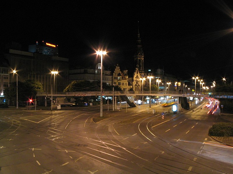 Blick vom Blauen Wunder am späten Abend auf das Blaue Wunder in Richtung Goerdelerring in Leipzig im August 2003 / Cmuelle8 [CC0], via Wikimedia CommonsDie Stahlkonstruktion führte von 1973 bis 2004 über den damaligen Friedrich-Engels-Platz, die heutige Straßenkreuzung Goerdelerring/Tröndlinring. Der Teil über den Tröndlinring wurde im Juni bis August 1973 vom DR Stahlbau Dessau erbaut. Der Teil über den heutigen Goerdelerring wurde Ende 1977 hinzugefügt. Die Brücke war zunächst hellblau angestrichen – ähnlich der gleichnamigen Elbbrücke in Dresden – und erhielt daher im Volksmund ihren Namen. Ab 1991 hatte sie einen grauen Anstrich, der eingebürgerte Beiname wurde jedoch beibehalten. Am 11. Juli 2004 wurde sie abgerissen.