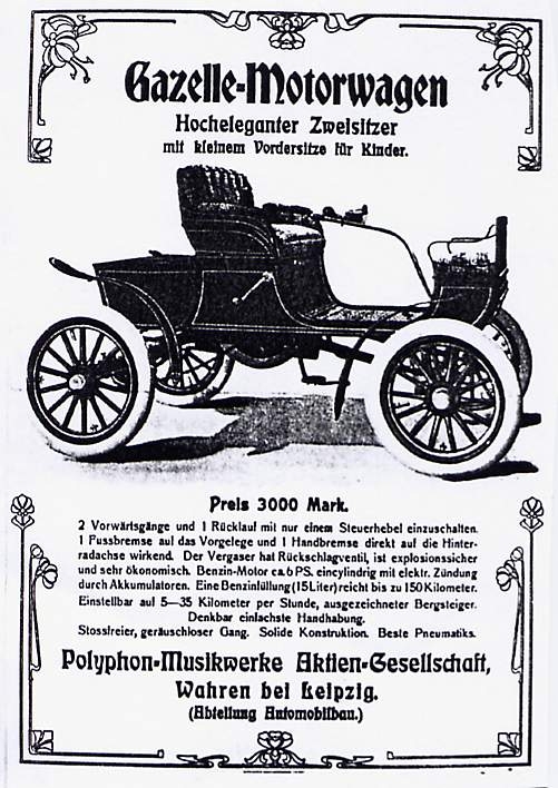 Gazelle-Motorwagen – Anzeige aus einer Zeitung aus dem Jahr 1904 Veröffentlicht am 20. Dezember 2018 210teilen twittern merken teilen BewertungGazelle-Motorwagen – Anzeige aus einer Zeitung aus dem Jahr 1904Polyphon-Musikwerke, Aktiengesellschaft Wahren bei Leipzig