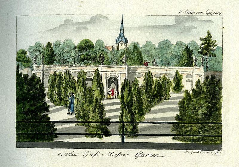 Im Großbosischen Garten mit dem Turm der Johanniskirche im Hintergrund, 1730 / Geisler, junior [Public domain], via Wikimedia Commons