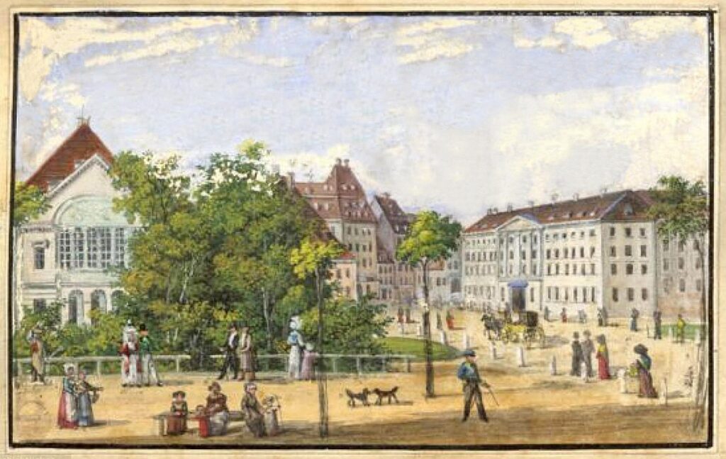 Nach dem Abriss mehrerer Altbauten entstand zwischen 1826 und 1832 das heutige Gebäude nach den Entwürfen von Albert Geutebrück. Der Platz erhielt aufgrund der Nähe zum Alten Theater die Bezeichnung „Theaterplatz“. Neben zahlreichen Geschäften beherbergte der Große Blumenberg auch das „Café Ziegler“, das später als „Café am Alten Theater“ bekannt wurde. Von 1857 bis 1859 lebte der Leipziger Mäzen Ferdinand Rhode in dem Gebäude.