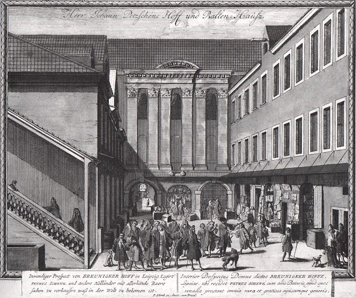 Hohmanns Hof in der Leipziger Petersstraße um 1900 / Unbekannt [Public domain]Seit 1629 besaßen Thomas Breunigke und dessen Erben einen Hof auf obigem Grundstück, auf dem schon vor 1530 ein Gasthof war. In Breunigkes Hof hatte der Kupferstecher und Kunsthändler Peter Schenk der Ältere (1660–1711) seine Wohnung, und Johann Petzsch betrieb hier ein Ballhaus.