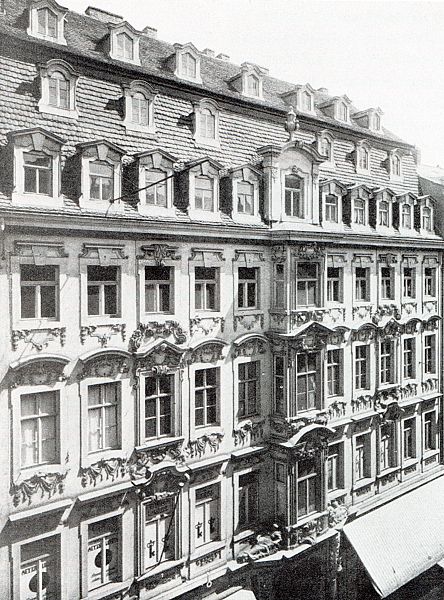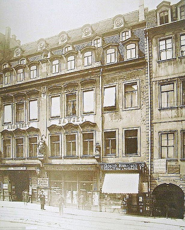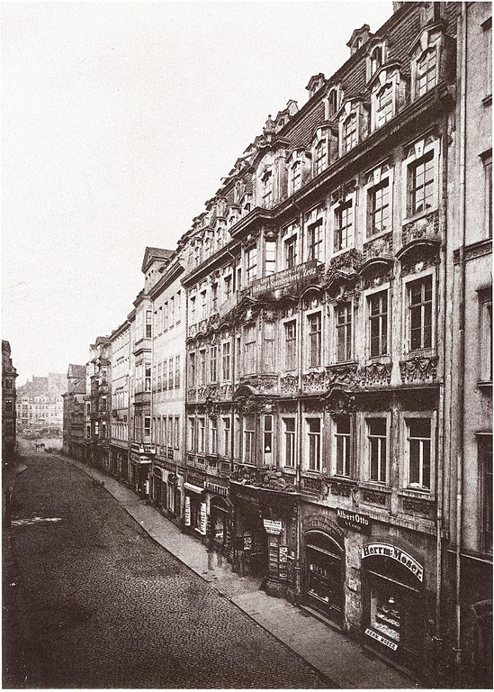 Die Neumarktseite von Hohmanns Hof in Leipzig um 1900 / Hermann Walter (1838–1909) [Public domain]In Hohmanns Hof lebte der Dichter und Übersetzer Adolf Böttger (1815–1870), der hier auch geboren wurde.
