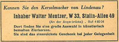 Kerzelmacher von Lindenau Walter Mentzer Veröffentlicht am 4. März 2019 272teilen twittern merken 0 teilen Bewertung Der Kerzelmacher von Lindenau Walter Mentzer, Lepzig W 33, Stalin-Allee 49 (An der Angerbrücke)