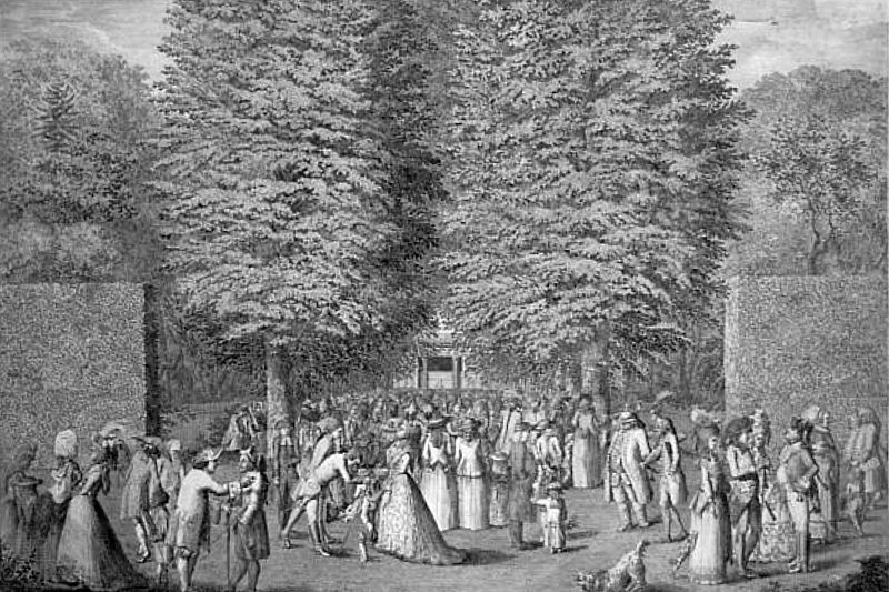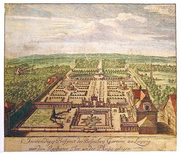 Der Kleinbosische Garten in Leipzig auf einem kolorierten Kupferstich von 1705 / Christian Heckel [Public domain]