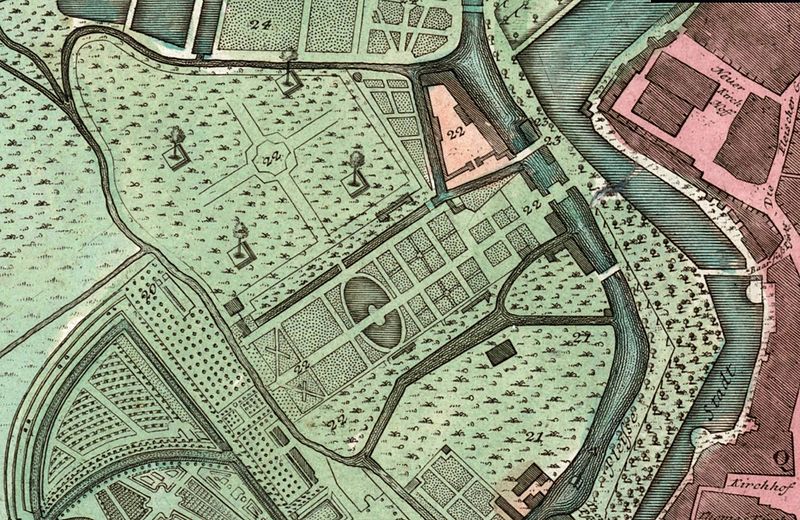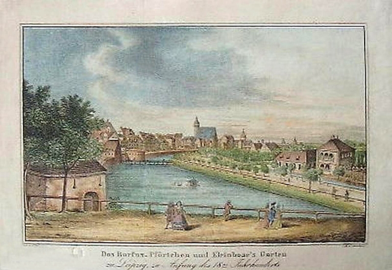 Der Kleinbosische Garten in Leipzig (rechts), von der Barfußpforte aus gesehen um 1715, kolorierte Lithografie / Straßberger (Lithograf) [Public domain]
