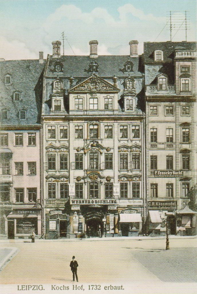 Kochs Hof in Leipzig (Marktseite) auf einer kolorierten Ansichtskarte / Unbekannt [Public domain], via Wikimedia Commons