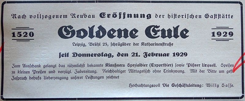 Leipzig – Goldene Eule, Wiedereröffnung nach Neubau – Anzeige (1929) Veröffentlicht am 17. Dezember 2018 284teilen twittern merken teilen BewertungLeipzig – Goldene Eule, Wiedereröffnung nach Neubau – Anzeige (1929)