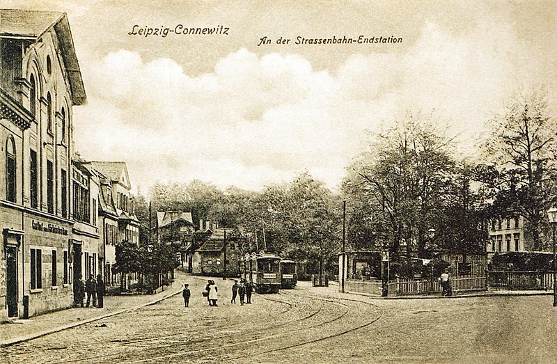 Die Endstelle „Eiskeller“ in Connewitz auf einer Postkarte von 1907. Links das „Sächsische Haus“ / Public Domain