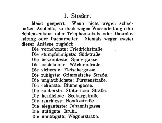 Meist gesperrt. Wenn nicht wegen schadhaften Asphalts, so doch wegen Wasserleitung oder Schleusenbaus oder Telephonkabels oder Gasrohrleitung oder Dacharbeiten. Niemals wegen zweier dieser Anlässe zugleich.