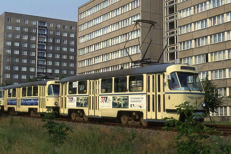 Zwei Tatra-T4D-Triebwagen mit einem B4D-Beiwagen in der Zwickauer Straße in Leipzig-Marienbrunn. Wegen der in Leipzig lange üblichen Weichensteuerung mit Oberstrom über Fahrleitungskontakte liefen (und laufen) die gesteuerten Triebwagen abgebügelt, die Fahrstromversorgung erfolgt über die Kontaktaufsätze der Scharfenbergkupplungen.