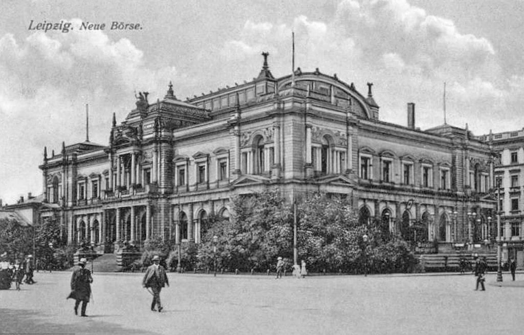 Das Gebäude entstand nach einem Entwurf der Leipziger Architekten Hans Enger und Karl Weichardt (1846–1906) als Ersatz für die Alte Handelsbörse am Naschmarkt. Adolf Lehnert (1862–1948) schuf die 3 Meter hohe Figur Lipsia im Giebel des Hauptportals nach einem Entwurf von Melchior zur Straßen (1832–1896). 1911 wurde es nach Plänen der Architekten August Hermann Schmidt (1858–1942) und Arthur Johlige (1857–1937) durch eine Aufstockung mit einem überstehenden, flach geneigten Walmdach erheblich verändert. Im Keller des Hauses befand sich ein Restaurant und im zweiten Obergeschoss ein großer Saal.