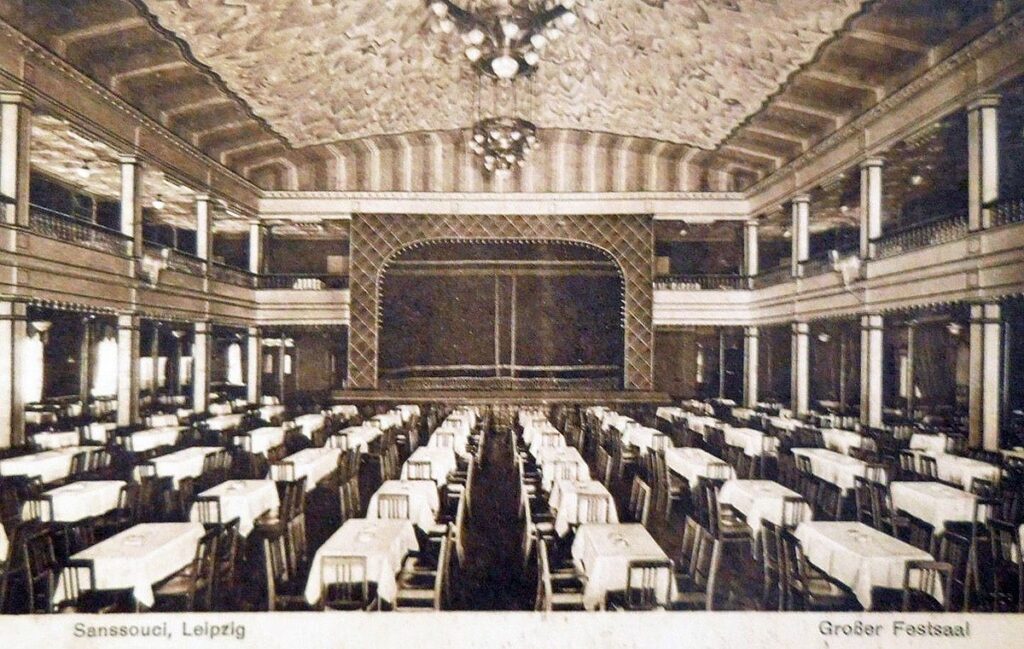 Festsaal im „Sanssouci“ Leipzig (früher Odeon) ca. 1930 / Unbekannter Autor Unknown author(Postkarte), Public domain, via Wikimedia Commons