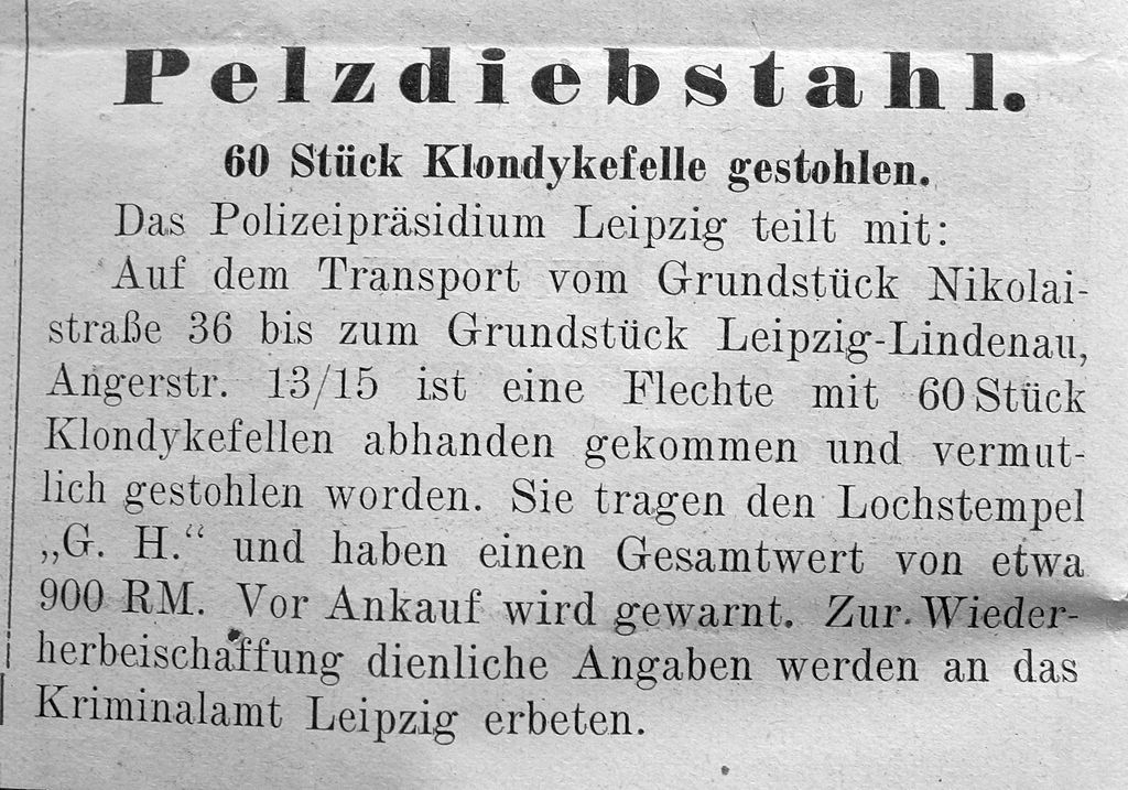 - Das Polizeipräsidium Leipzig teilt mit: Auf dem Transport vom Grundstück Nikolaistraße 36 bis zum Grundstück Leipzig-Lindenau, Angerstraße 13/15 ist eine Flechte mit 60 Stück Klondykefellen abhanden gekommen und vermutlich gestohlen worden. Sie tragen den Lochstempel „G. H.“ und haben einen Gesamtwert von etwa 900 RM. Vor Ankauf wird gewarnt. Zur Wiederherbeischaffung dienliche Angaben werden an das Kriminalamt Leipzig erbeten.